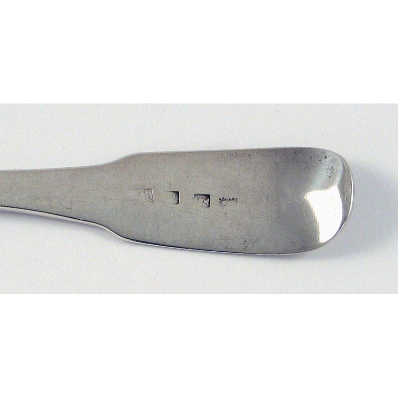 A George III Scottish provincial fiddle table fork, crested, by Joseph Pearson, Dumfries (IP, Anchor, stag's head, S), c.1800, 2oz.