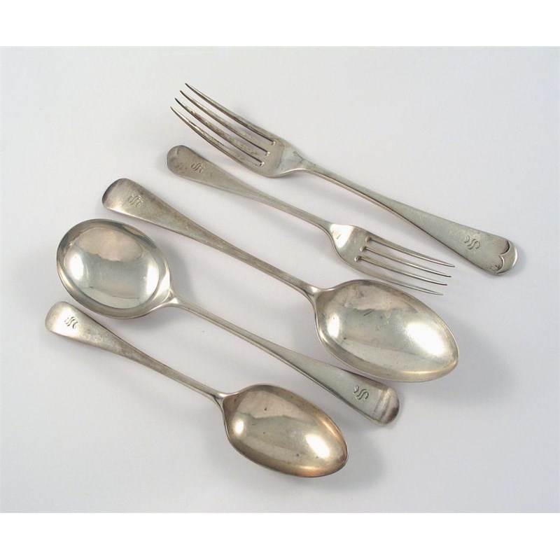 A modern half dozen service of old English pattern flatware comprising: Tablespoons Soup spoons table forks dessert forks dessert spoons all initialled 'S', by Messers Hutton & Son Ltd, Sheffield, 1923, 62oz, (30).