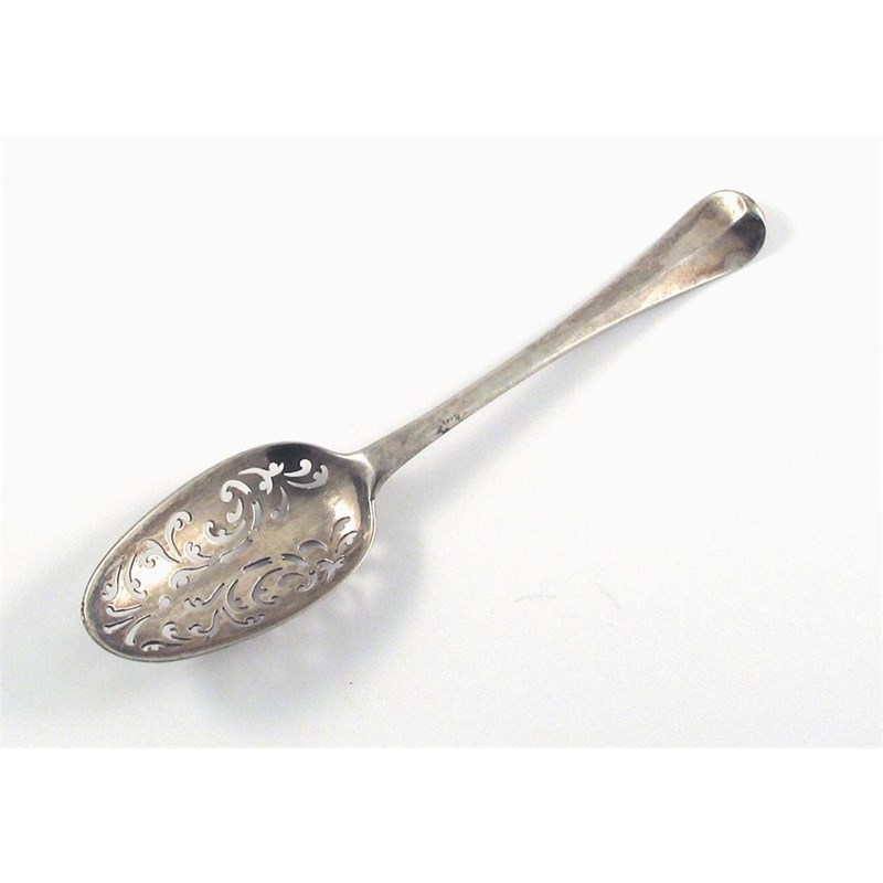 An early George II Hanoverian tablespoon, pierced with scrolls for use as a strainer, with a coat of arms on the back of the stem, by William Toone, London, circa 1725 (date letter worn), 1.75oz.
