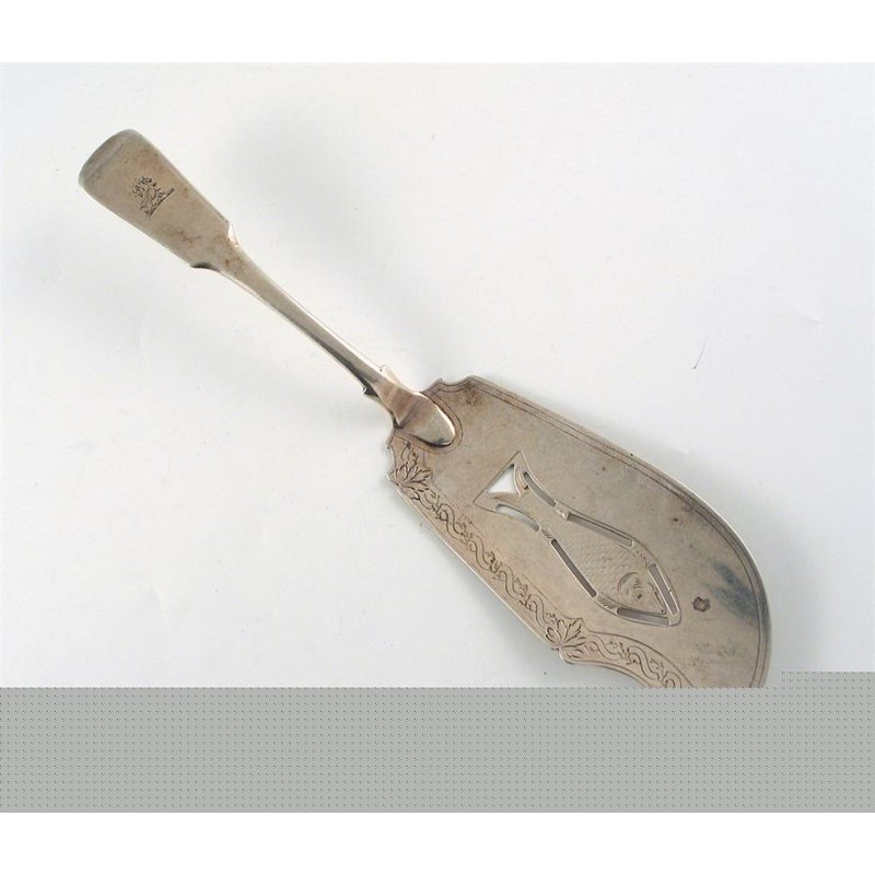 A George III Scottish fish slice, with pricked border and a pierced and engraved fish in the blade, fiddle stem, crested, by Mitchell & Russell, Edinburgh, 1813, 4oz.
