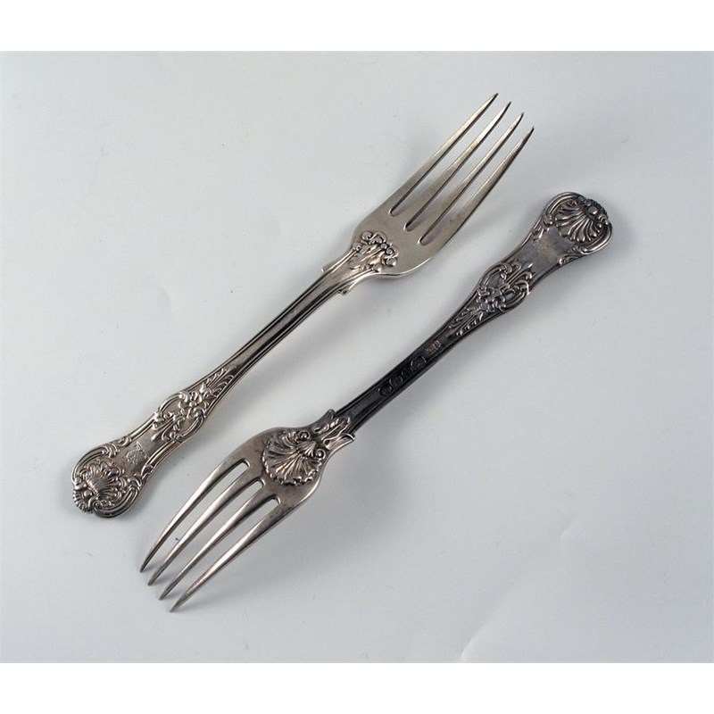 Queens pattern dessert forks: A set of six single struck, initialled 'H C', by George Adams, London, 1857 and a set of six George IV examples, crested, by Morris and Michael Emanuel, London, 1827, 22oz, (12).