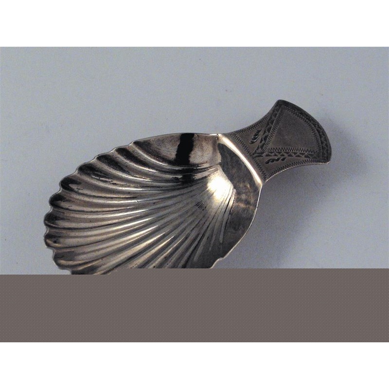 A George III fluted caddy spoon, with a bright cut lug handle, by Josiah Snatt, LOndon, 1802.
