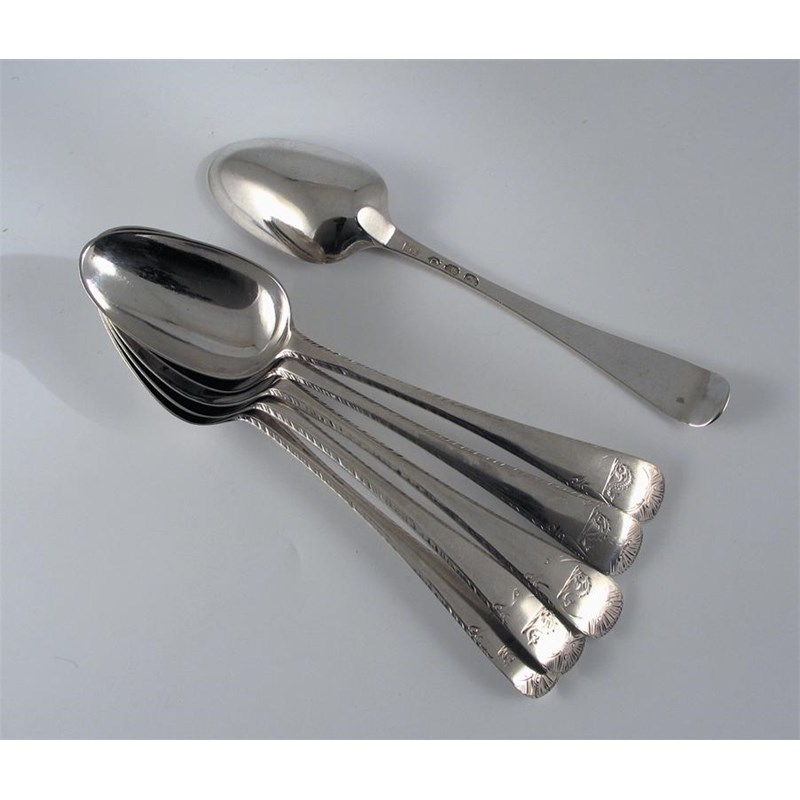 A set of six George III Irish tablespoons, with feather edging and a scroll cartouch engraved with a dolphin crest, by Michael Keating, Dublin, 1775, 10oz, (6).