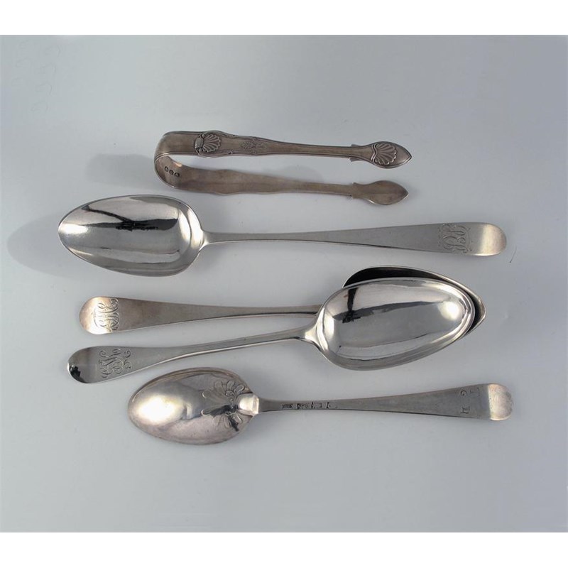 A mixed lot: comprising one Irish and two Scottish tablespoons; a George III fancy back tablespoon and a pair of Kings, variant sugar tongs by William Bateman, London, 1818, 9oz, (5).