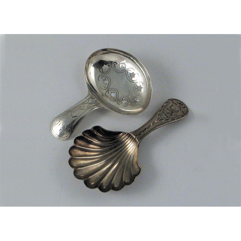 A George III bright-cut provincial spoon, with a scallop shell bowl, crested, by John Mitchison, Newcastle, circa 1790 (no date letter) and a George III Birmingham example, the oval bowl pierced with mulletts, by Joseph Taylor, 1805, (2).