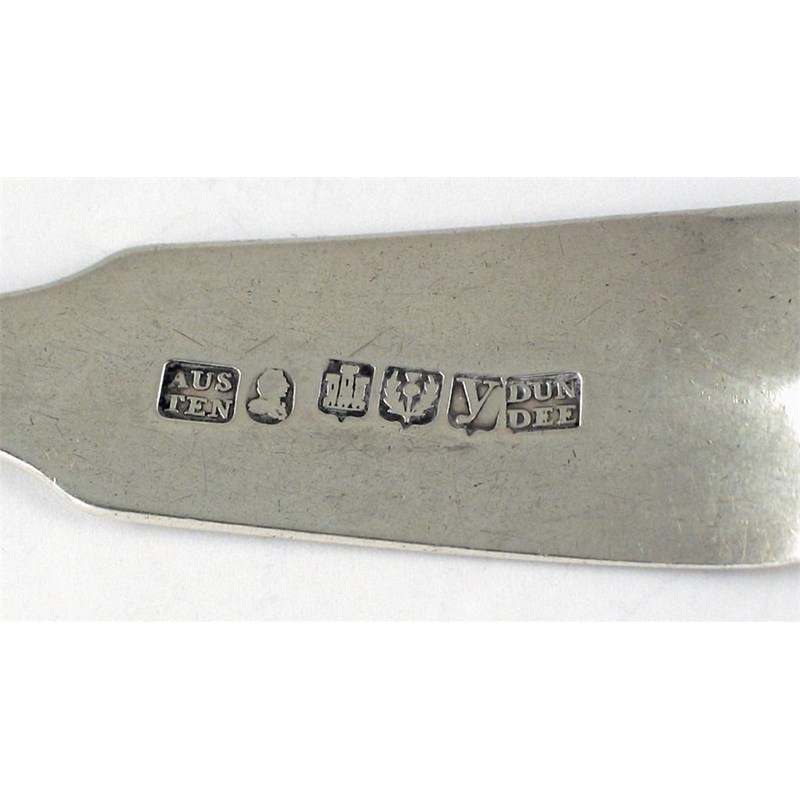 A William IV Scottish provincial fiddle tablespoon, initialled 'P W' and 'W', by John Austen of Dundee (AUS over TEN and DUN over DEE), with Edinburgh hallmarks for 1830, 2.5oz.