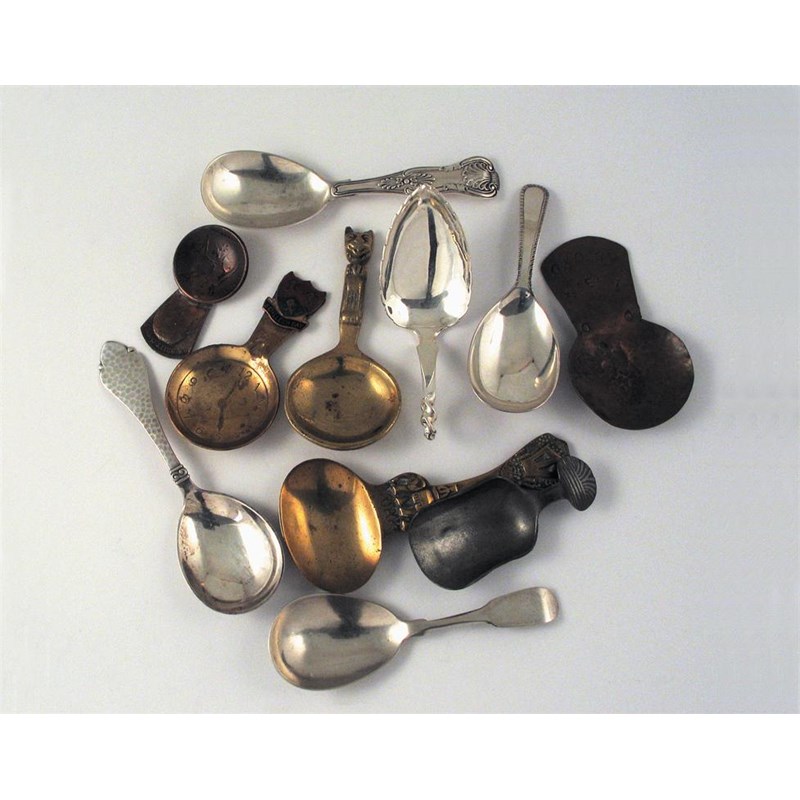 Assorted caddy spoons including: A Kings pattern example, by Henry Holland, London, 1870; a modern feather - edge spoon; a Victorian fiddle caddy spoon; a Scandinavian caddy spoon; a Scandinavian leaf bowl spoon; two copper spoons; three brass spoons and a pewter caddy scoop, (11).