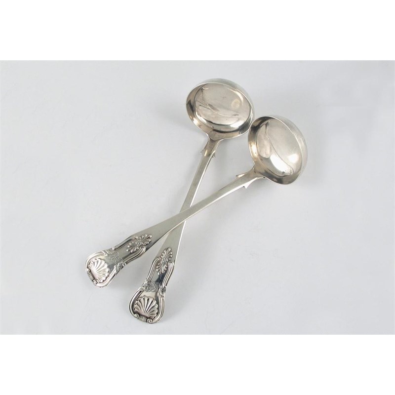 A pair of William IV Scottish toddy ladles, single struck Kings pattern with shoulders, initialled 'R', maker S W, unascribed, Edinburgh, 1835, 2.25oz, (2).