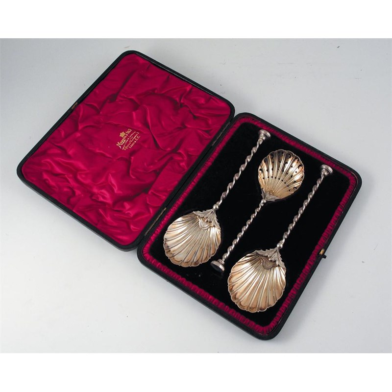 An Edwardian cased pair of silvergilt fruit serving spoons, and a matching sugar sifter spoon with scallop shell bowls twisted stems are seal terminals, by Mappin & Webb, London 1901, 5.5oz.