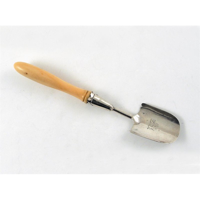 A George III stilton scoop, crested, with a turned ivory handle, by Samuel Pemberton, Birmingham, 1810, 6in (15cm)/