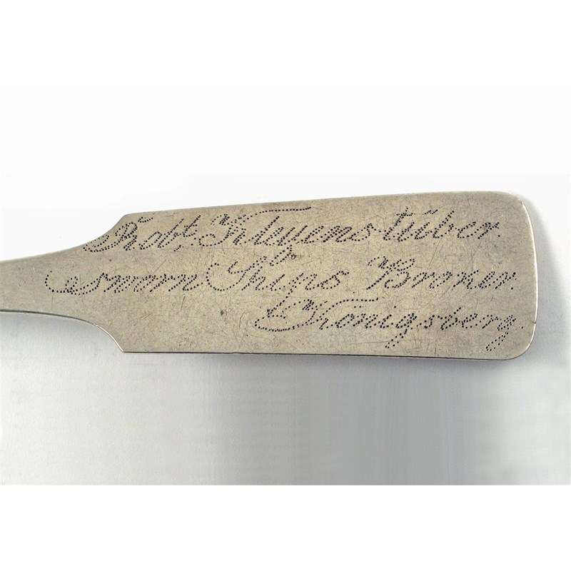 A 19th century Baltic tablespoon, with a pricked inscription 'Robert Kleyens-Tuber. sworn ships broker. Konigsberg', maker Fournier, Konigsberg, circa 1840, 2oz.