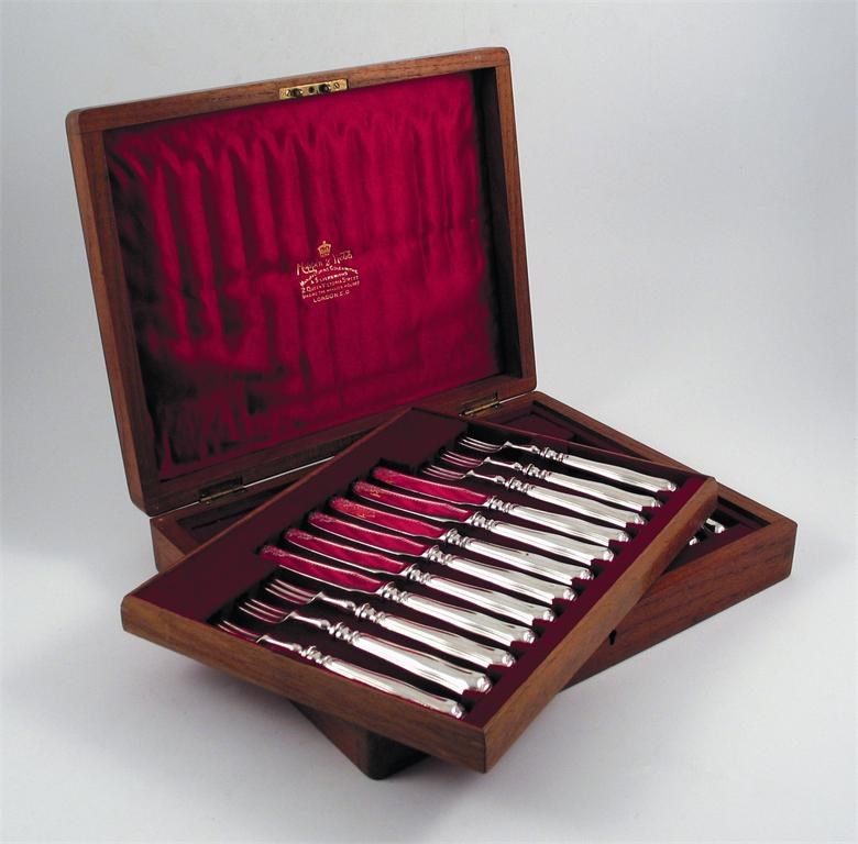 A cased set of twelve pairs of plated fruit knives & forks, with shaped thread pattern handles and engraved blades, by Mappin &Webb, c.1900.