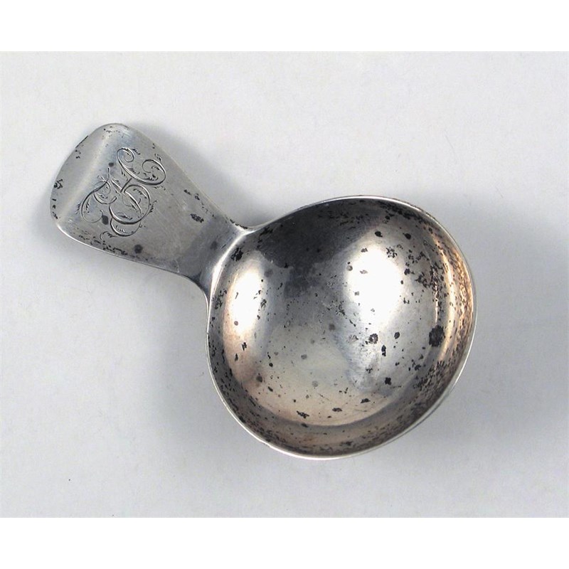 A George III Irish caddy spoon, with a plain circular bowl, initialled 'E.H.' by Michael Keating, Dublin c.1800 (no date letter).