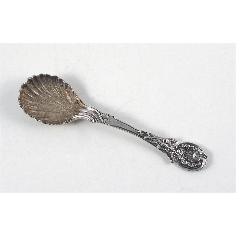 A Victorian east preserve spoon, with gilt shell bowl and a rocaille stem and terminal by John E. Terry, London 1847, 6.9in (17.5cm), 2.5oz.