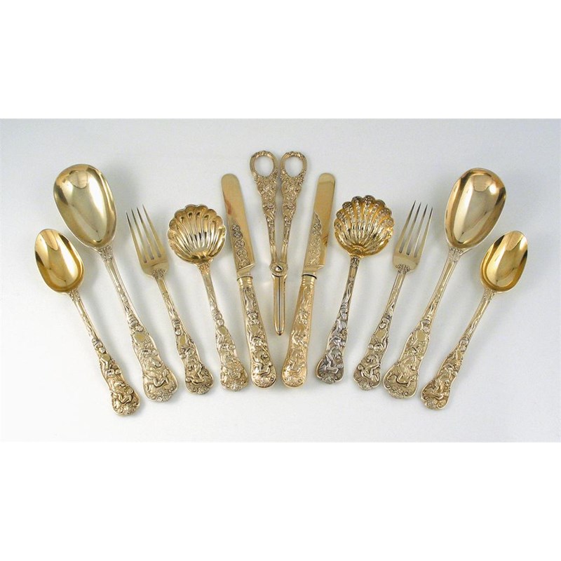 A late Victorian silvergilt Bacchanalian pattern dessert service, for eighteen place settings: dessert spoons dessert forks dessert knives (loaded handles) and six serving spoons a pair of grape shears a cream ladle and a sugar sifter ladle all by J Wakely and F.C. Wheeler, London, 1891, except the sugar sifter - by Messers Lias, London, 1874, contained in a fitted, four drawer brass inlaid coromandel cabinet, the case 13in (33cm) high, 113oz weighable (63).