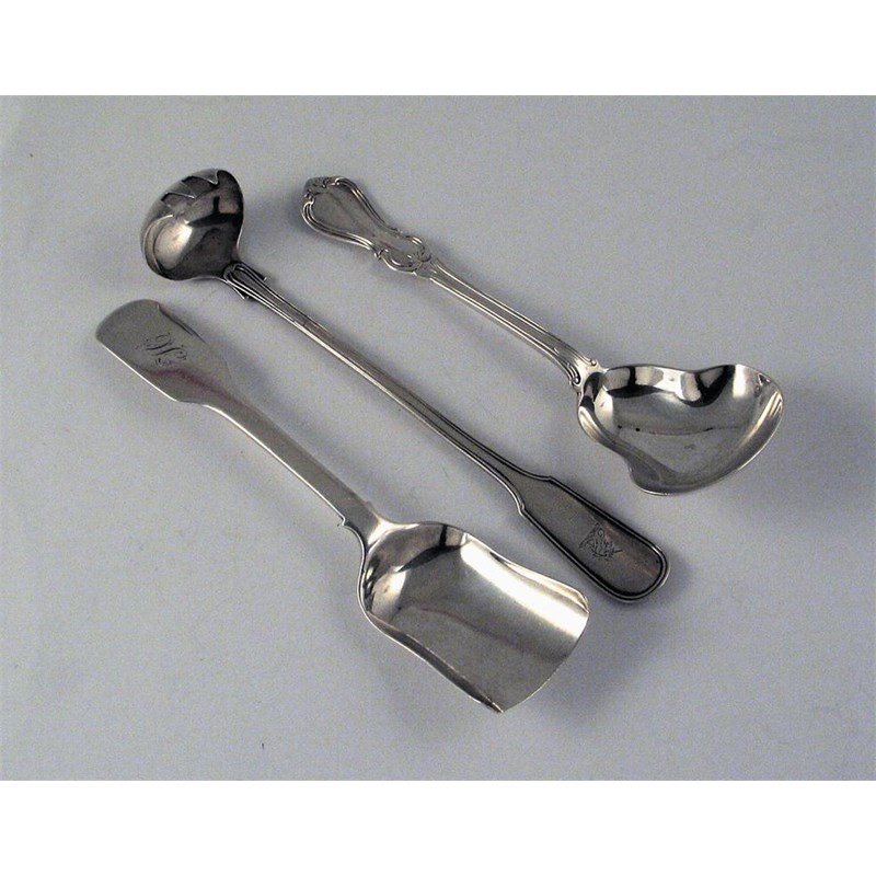 A Victorian Marriot patent pickle spoon, crested, by Martin Hall & Co., Sheffield, 1863; a Victorian Albert pattern sugar spoon, London, 1849 and a early Victorian provincial fiddle sugar scoop, initialled 'H', by George Lowe II, Chester, 1837, (3).