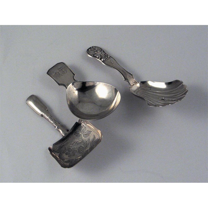 A George III caddy spoon, by S Godbehere, E Wigan and I Bult, London, 1802; a Victorian spoon with a fan shaped bowl and a William IV example with an engraved oblong bowl and a fiddle pattern stem, (3).
