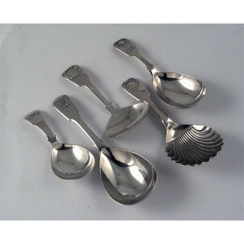 Five assorted fiddle pattern caddy spoons, mixed designs, makers and dates, including one by William Marshall, Edinburgh, 1844, (5).