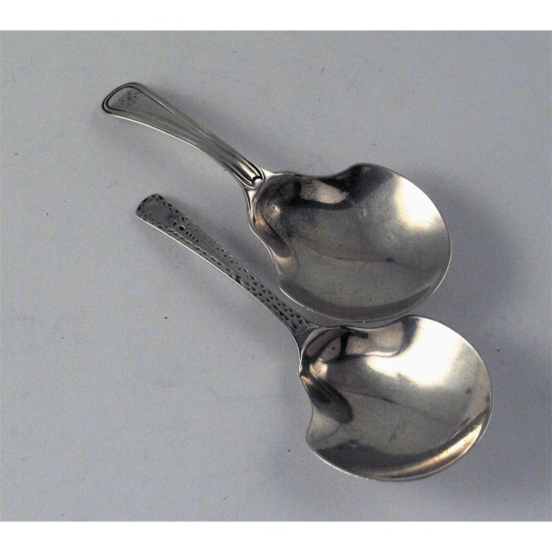 Two George III caddy spoons, with waisted bowls; one with a bright-cut stem the other with a thread stem, initialled 'B', both by Thomas Wallis, London, 1791 and 1809 respectively, (2).