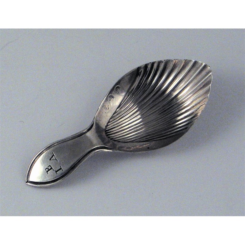 A George III provincial caddy spoon, with a stamped fluted bowl, and a navette shaped stem, initialled 'B' over 'I A', by Nathaniel Smith and Co., Sheffield, 1794.