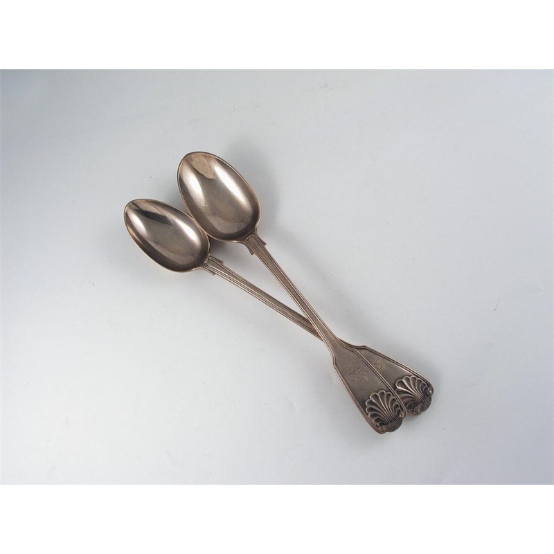 A late Victorian fiddle, thread and shell pattern basting spoon, double crested, by Elkington & Co, Birmingham, 1899, together with another similar, crested, by J K Bembridge, London, 1890, 15oz.