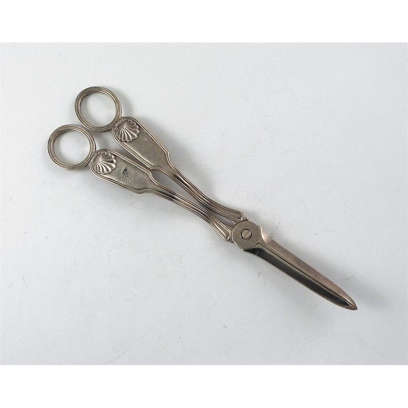 A pair of Victorian fiddle, thread and shell grape shears, (single struck), crested, by Messers J and J Williams, Exeter, 1861, 8in (20.2cm), 3.8oz.