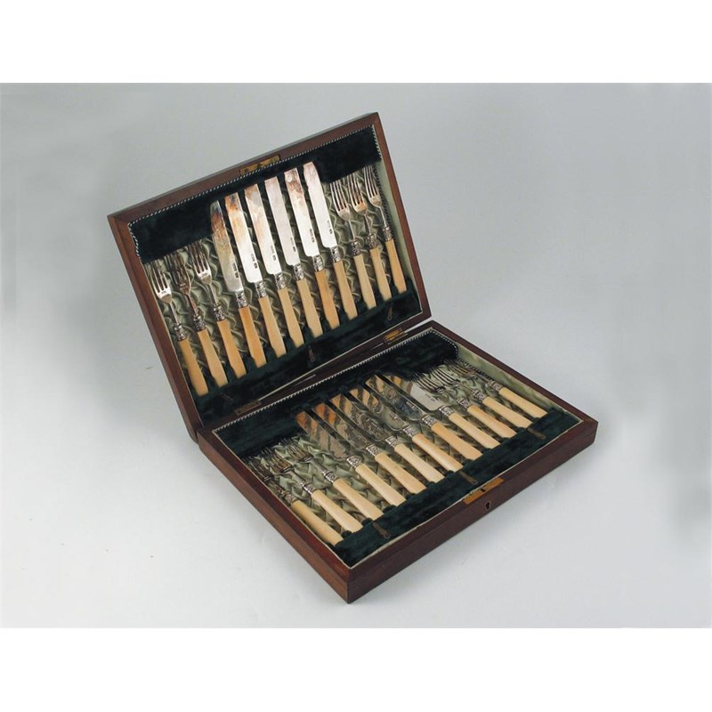 A late Victorian cased set of twelve pairs of dessert knives and forks