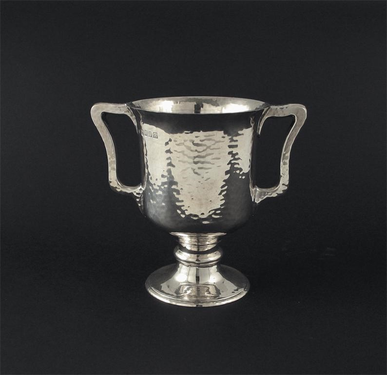 A modern Scottish two handled cup, with a hammered finish and a pedestal foot, J.Forest, Glasgow 1923, 5.5in (11.5cm)high, 7.25oz.
