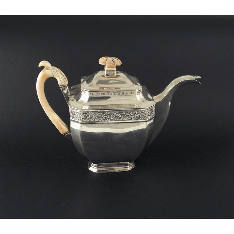 An early 19th century Russian tea pot, with ivory handle and finial, and a frieze of stamped roses, monogrammed, maker B C, Moscow, 1833, 16oz.