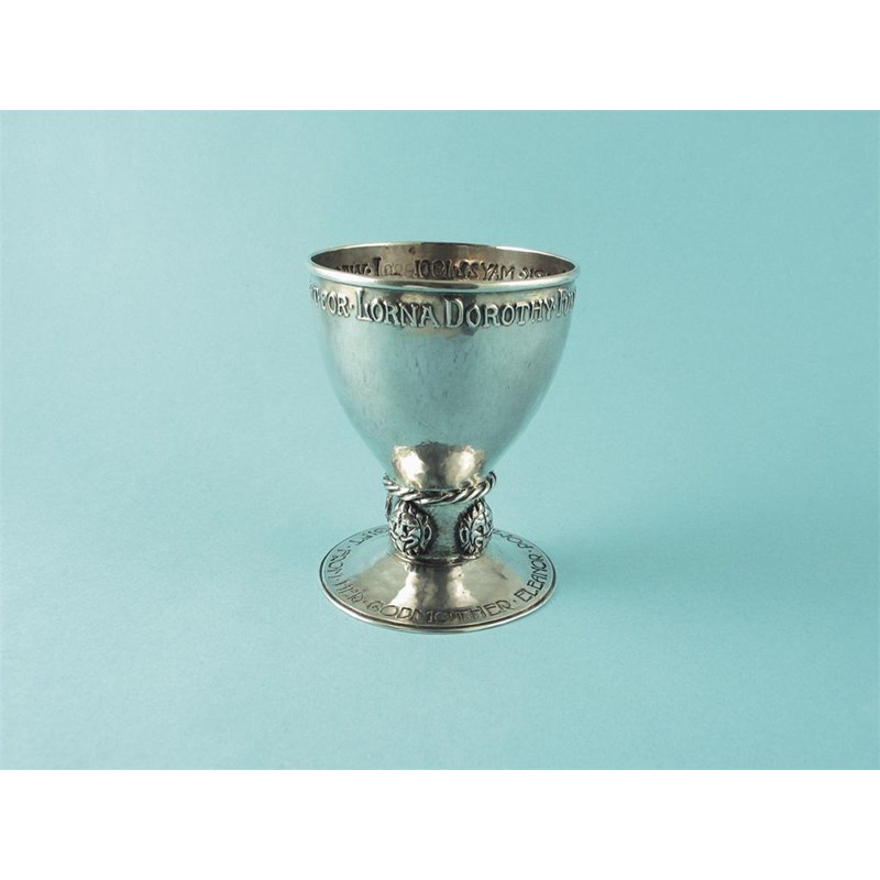 By Ramsden & Carr: an Edwardian goblet with applied Leopards' heads around the stem, and raised inscription 'I was wrought for Lorna Dorothy , Fuller-Clark, May 22 1901', the foot chased, 'a gift from her godmother Eleanor Pomeroy' London 1901, 3.9in (10cm)high, 3.5oz.