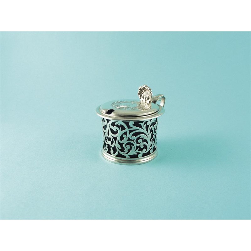 A Victorian pierced mustard pot, with blue glass liner, an engraved cover and a shell thumbpiece, crested, by Charles Thomas and George Fox, London 1845, 2.75in (7cm)high, 3oz weighable silver.