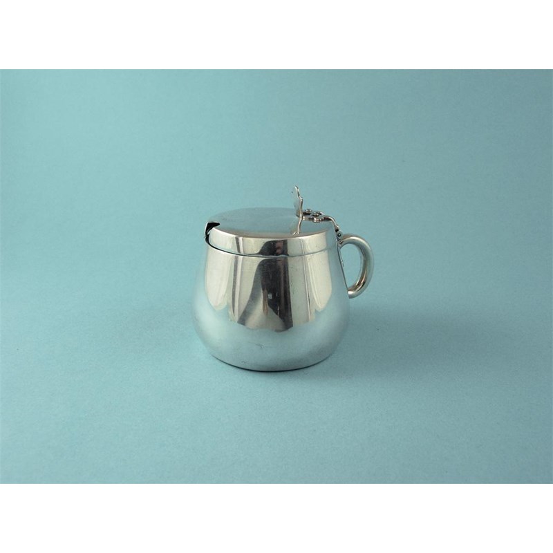 A Victorian mustard pot, with a strap hinge and a c-shaped handle, gilt interior and blue glass liner, by Hunt and Roskell, London 1870, 4.75oz weighable silver, 2.75oz (7.2cm) high.