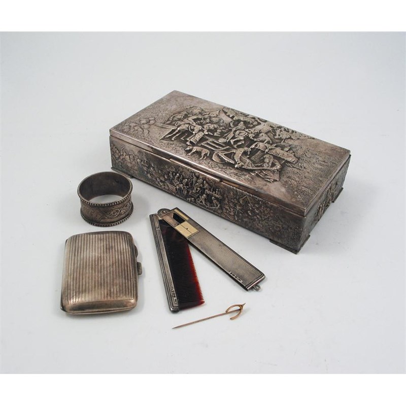 A mixed lot: plated cigarette box, together with a cased horseshoe stickpin, a folding comb and engraved napkin ring with gadrooned border and a small cigarette case. (5)