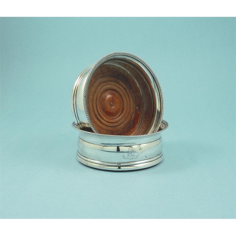 A pair of George III wine coasters, with everting gadrooned rims, and turned wooden bases, crested, makers marks worn, London, 1807, 5.5in (14cm) diameter.