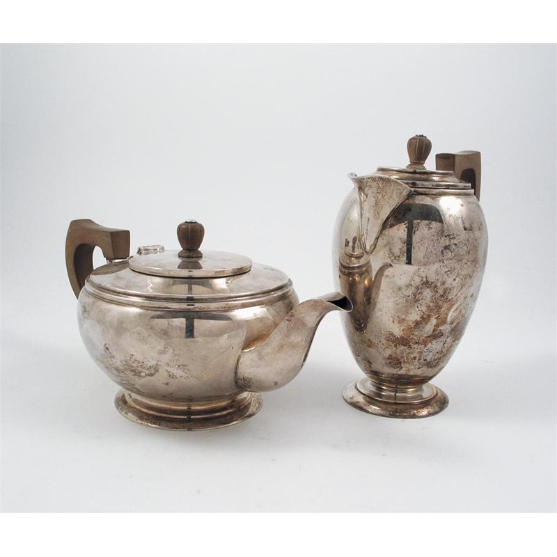 A modern tea pot and hot water jug, on spreading circular bases with angular handles, makers mark LE, London 1939, 36oz (2).