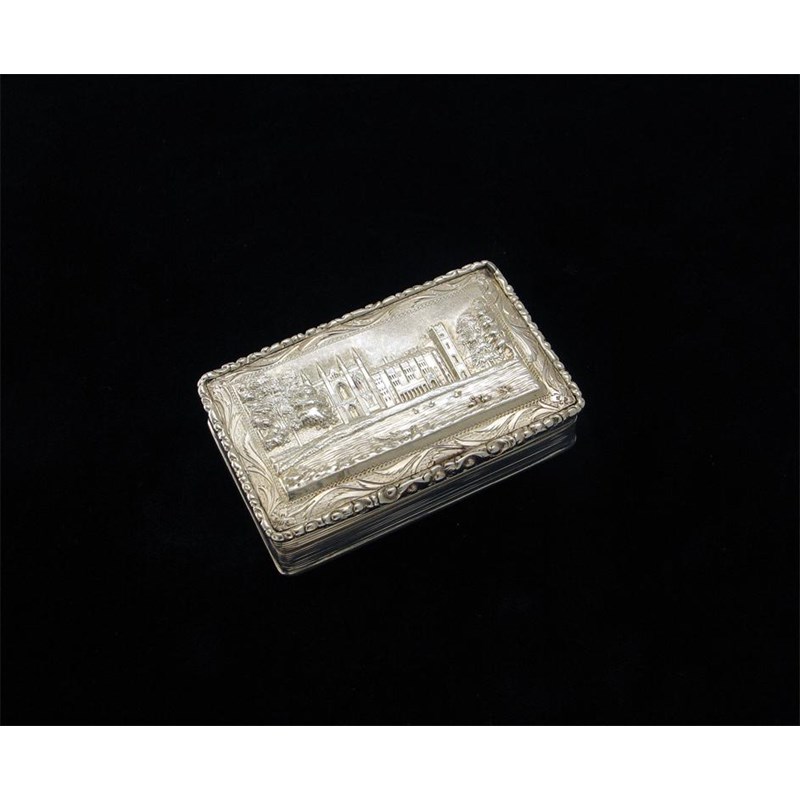 An early Victorian castle top box, with a view of Newstead Abbey on the cover in low relief, engine turned base and gilt interior, by Edward Smith, Birmingham, 1838, 3.2in (8cm), 4.4oz.