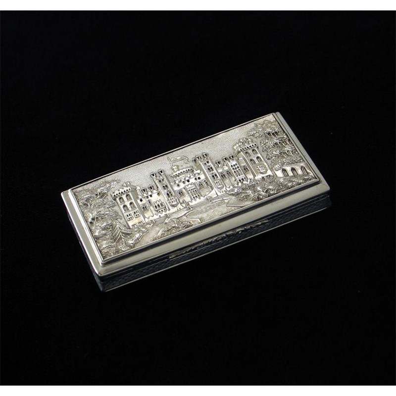 An early Victorian 'castletop' box, with engine-turning and a view of Windsor Castle in relief on the cover, the base with a small oblong cartouche, inscribed "Presented by the Children of the Deanery Schools, St Burgan to Mr H. Lee, Lady Day 1846", gilt interior, by Nathaniel Mills, Birmingham 1838, 2.85in (7.2cm), 1.8oz.