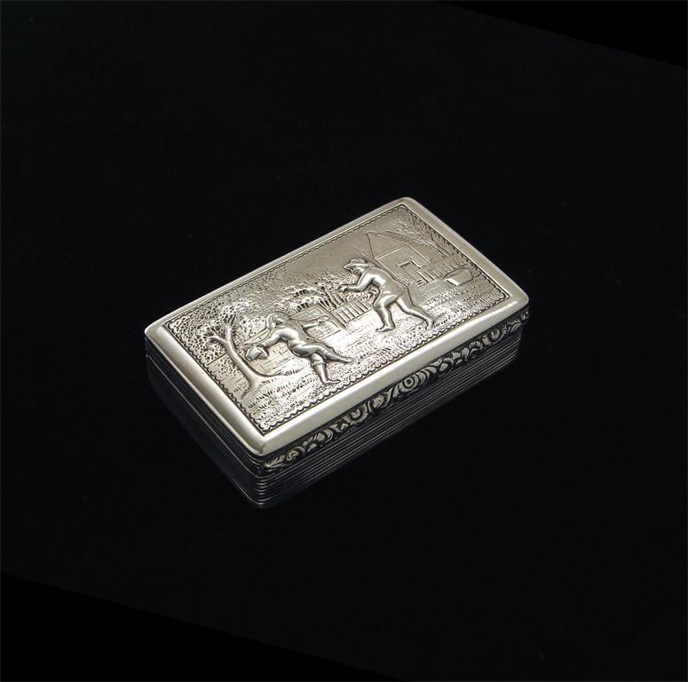 A William IV box, with reeded sides, embossed and chased in relief, with two dancing peasants, gilt interior, by Francis Higgins, London 1832, 3.25in (8.2cm), 4.5oz.