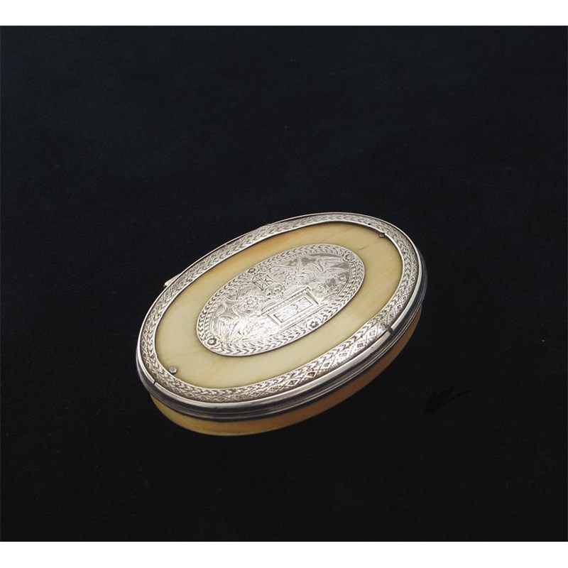 A late 17th/early 18th century mounted ivory, "Memento Mori" snuff box, with a stand away hinge, engraved oval plaque on the cover, unmarked, c.1700, 3.45in (8.7cm).