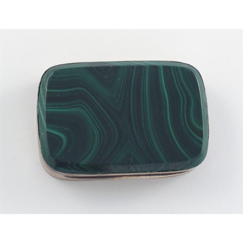 A snuff box, of rounded oblong form with a gilt interior and a hinged cover set with a bevelled panel of malachite, makers mark 'RH', struck four times, unascribed, first half of 19th century, 2.1in (5.5cm) wide.