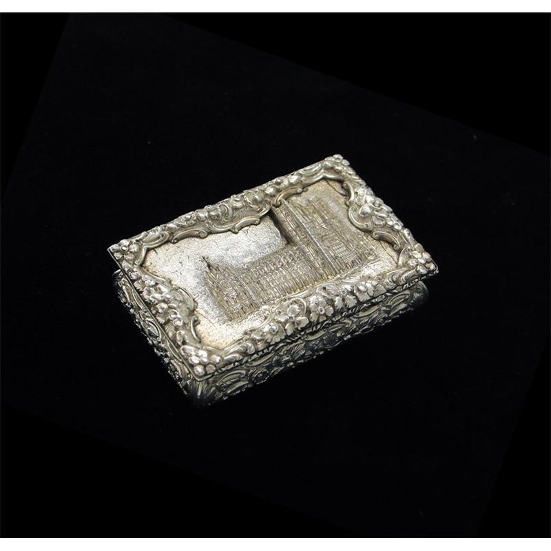 An early Victorian castle top box, with chased convex sides and a view of Westminster Abbey in relief on the cover, within a floral border, gilt interior, by Natthaniel Mills, Birmingham 1838, 3in (7.6cm), 3.75oz.