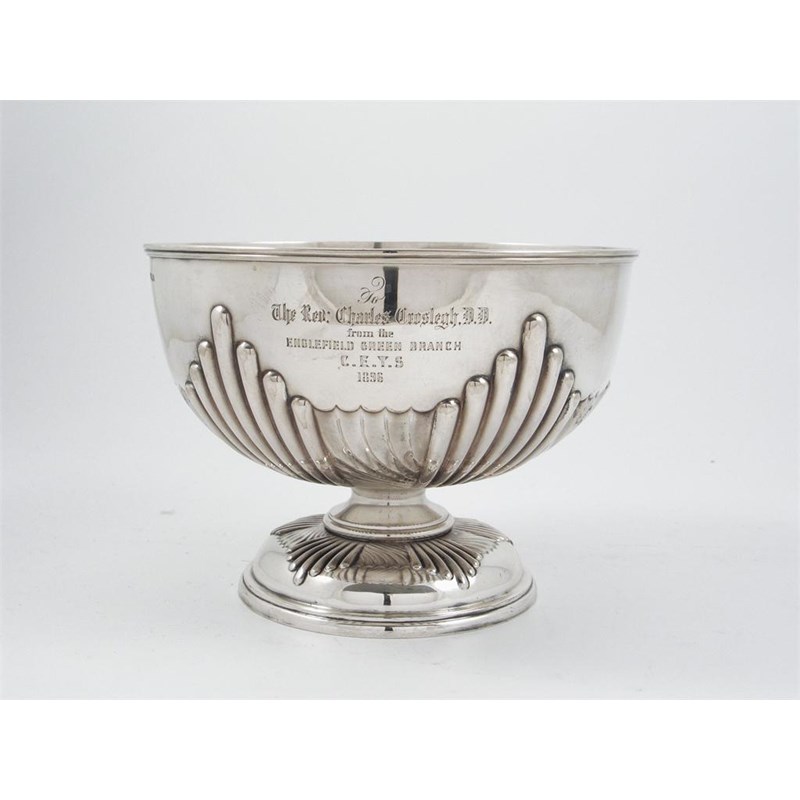 A late Victorian rose bowl, on a domed foot, decorated with bats wing fluting, with small inscription, crest and coat of arms, by James Dixon & Sons Ltd, Sheffield, 1896, 8in (20.5cm), 20oz.