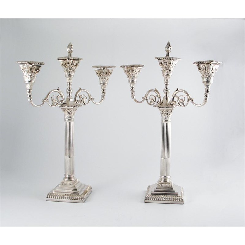 A pair of plated three light candelabra, with Corinthian columns, stepped square bases and torch finials (can be converted to make a five light candelabrum), 18in (46cm) high, 13in (33cm) span of branches.