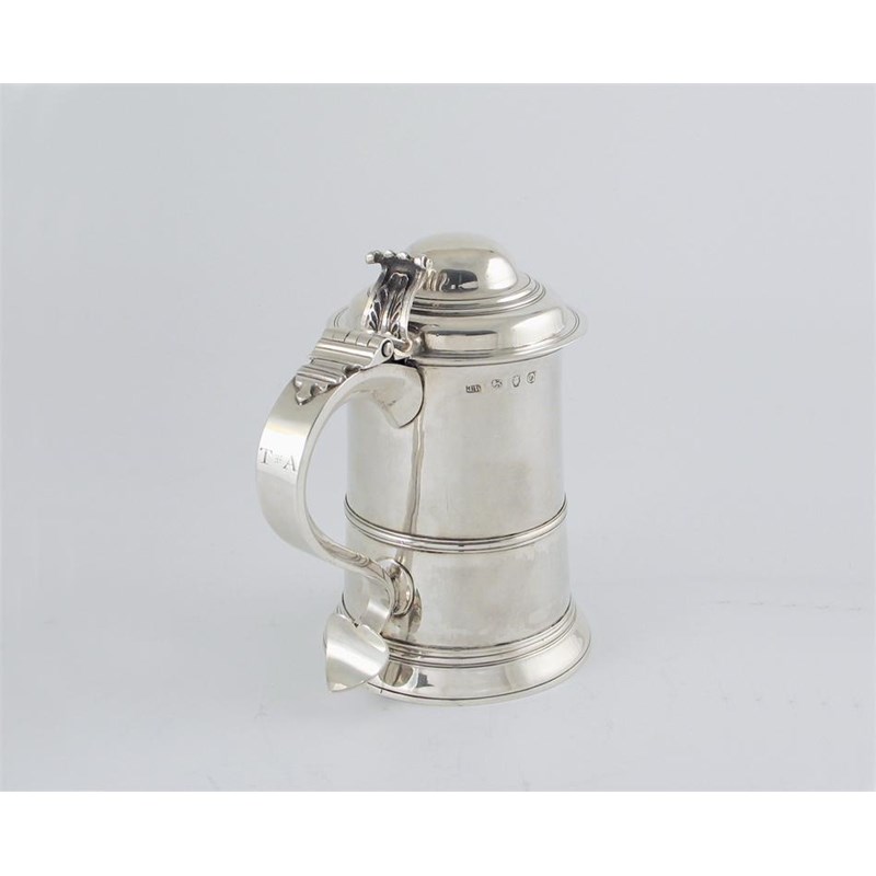 A George III tankard, of tapering form, with skirted base, an applied girdle, and a domed cover with broad rim and a large scroll thumbpiece, the handle scratched T A, by Thomas Wallis, London, 1771, 7.5in (19cm), 24oz.