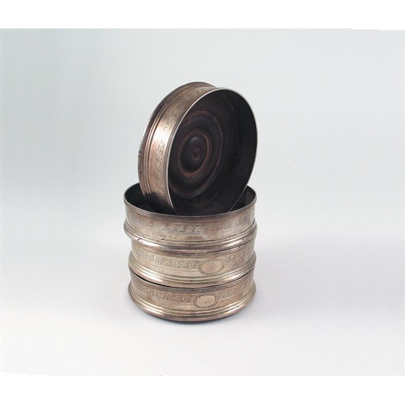 Two very similar pairs of George III wine coasters, with reeded rims, turned mahogany bases and a bright engraved frieze of foliate motifs on a hatched ground, vacant wreath catouches, two by Henry Nutting, an unascribed maker '?G', both pairs London 1796, 5" (12.7cm) diameter. (4)