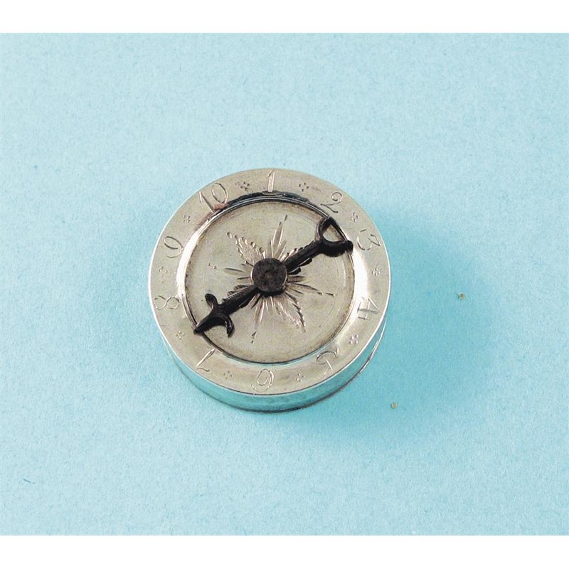 A George III circular pill box and cover, with an engraved dial, numbered '1-10' and a steel pointer hand , by Joseph Taylor, Birmingham 1798, 1.1in (2.8cm)diameter.