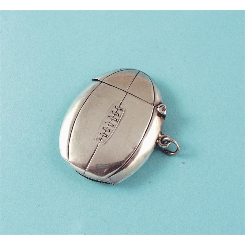 An Edwardian vesta case, in the form of a rugby ball, by W.H.Sparrow, Birmingham 1905, 2in (5cm), 0.5oz.