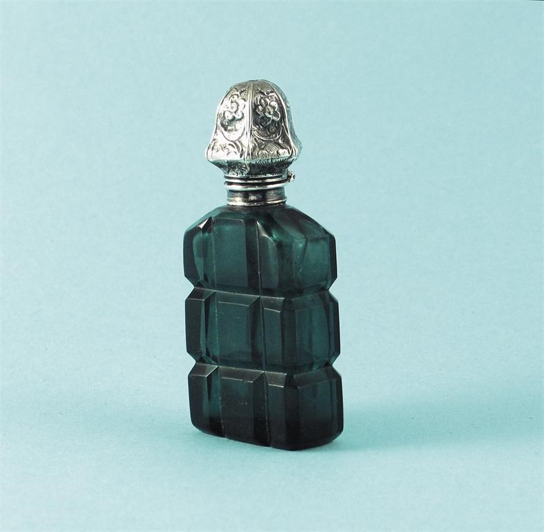 A Victorian mounted dark green oblong scent flask, with a hinged domed cover, chased with flowers, unmarked, circa 1860, 3in (7.8cm).