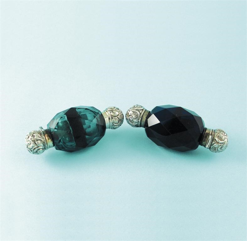 Two very similar double ended faceted glass scent bottles; one green and one blue