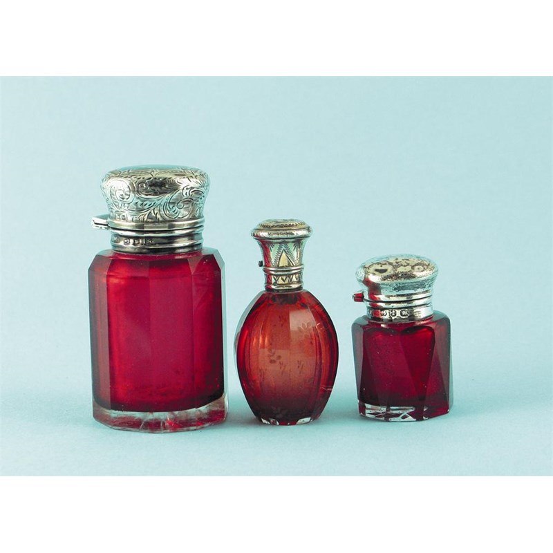 Two late Victorian mounted smelling salts bottles, with hinged covers and faceted red glass bodies, together with a late 19th century French mounted ovoid amber coloured glass scent decorated with foliate sprigs.